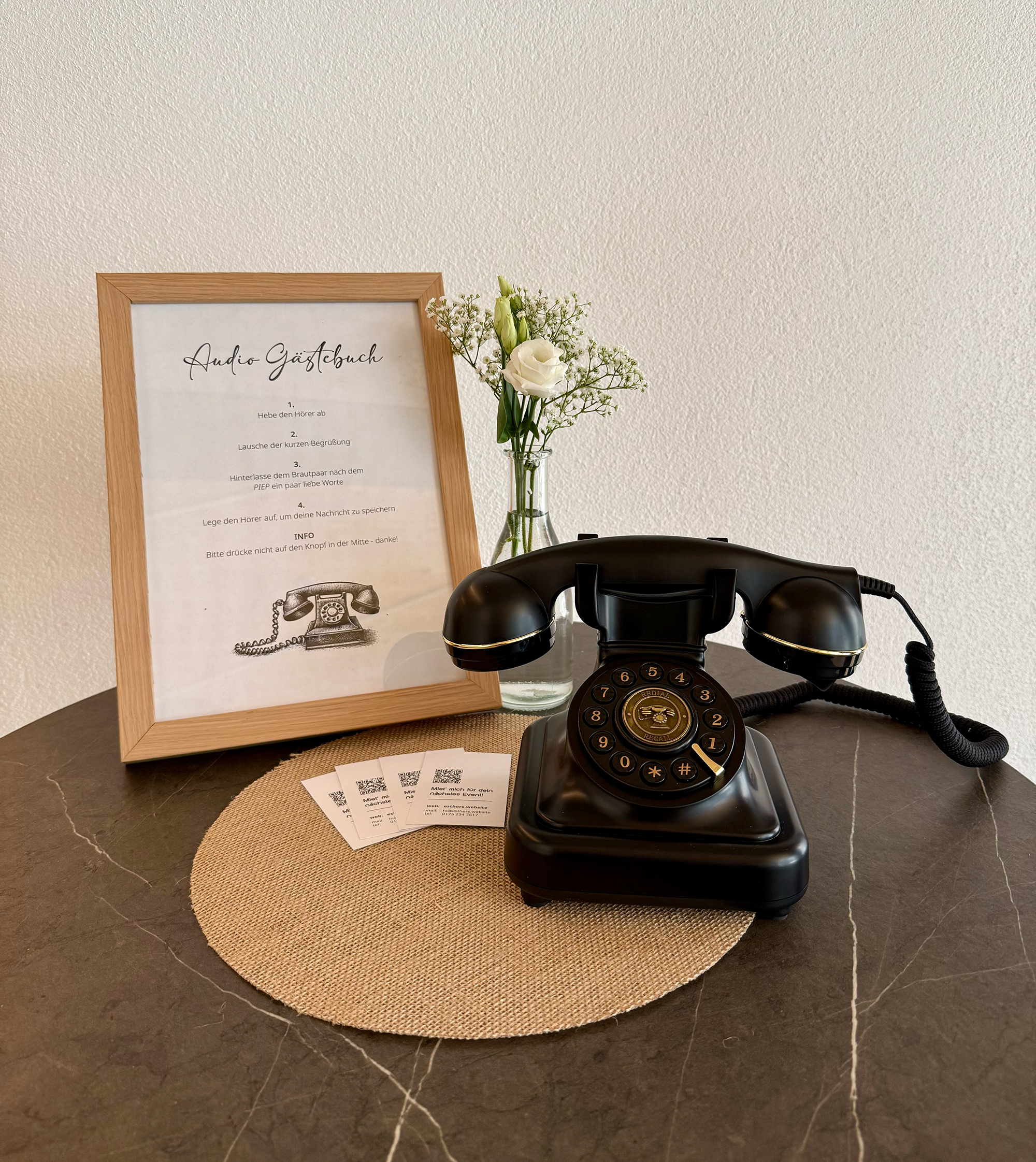Das Audio-Gästebuch benötigt kaum Platz. Stelle es am Besten auf einem Tisch ab, zu dem deine Gäste guten Zugang haben.